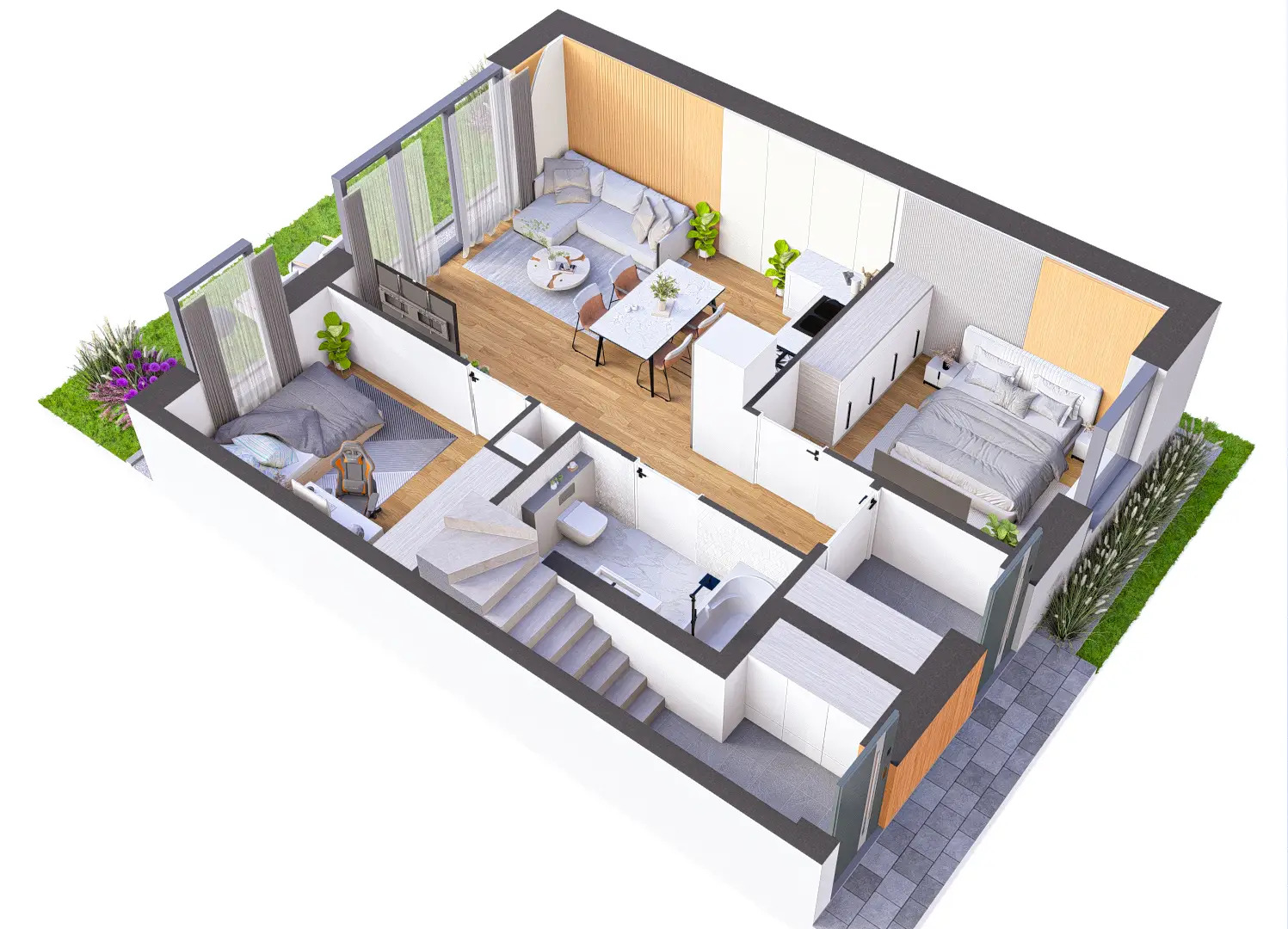 Możliwość zakupu dwóch lokali z jednego segmentu: parter i piętro oraz połączenie ich w jedno duże mieszkanie dwupoziomowe.